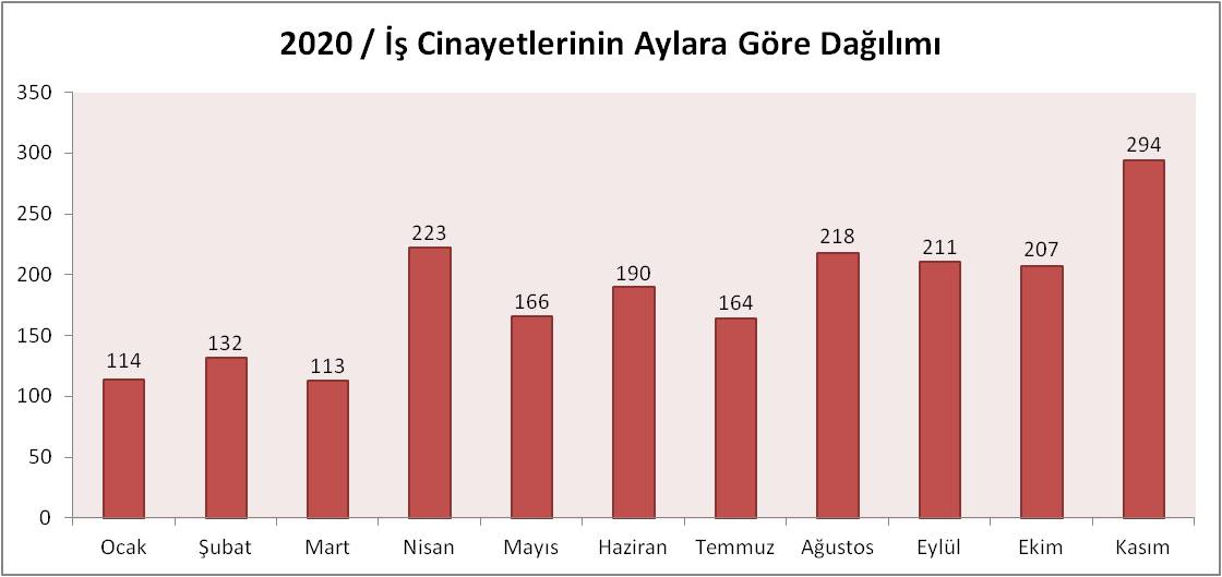 • İş cinayetlerinin aylara göre dağılımına baktığımızda Ocak ayında en az 114 işçi, Şubat ayında en az 132 işçi, Mart ayında en az 113 işçi, Nisan ayında en az 223 işçi, Mayıs ayında en az 166 işçi, Haziran ayında en az 190 işçi, Temmuz ayında en az 164 işçi, Ağustos ayında en az 218 işçi, Eylül ayında en az 211 işçi, Ekim ayında en az 207 işçi ve Kasım ayında en az 294 işçi hayatını kaybetti. 2020 yılının ilk on bir ayında iş cinayetlerinde en az 2032 işçi arkadaşımızı kaybettik...