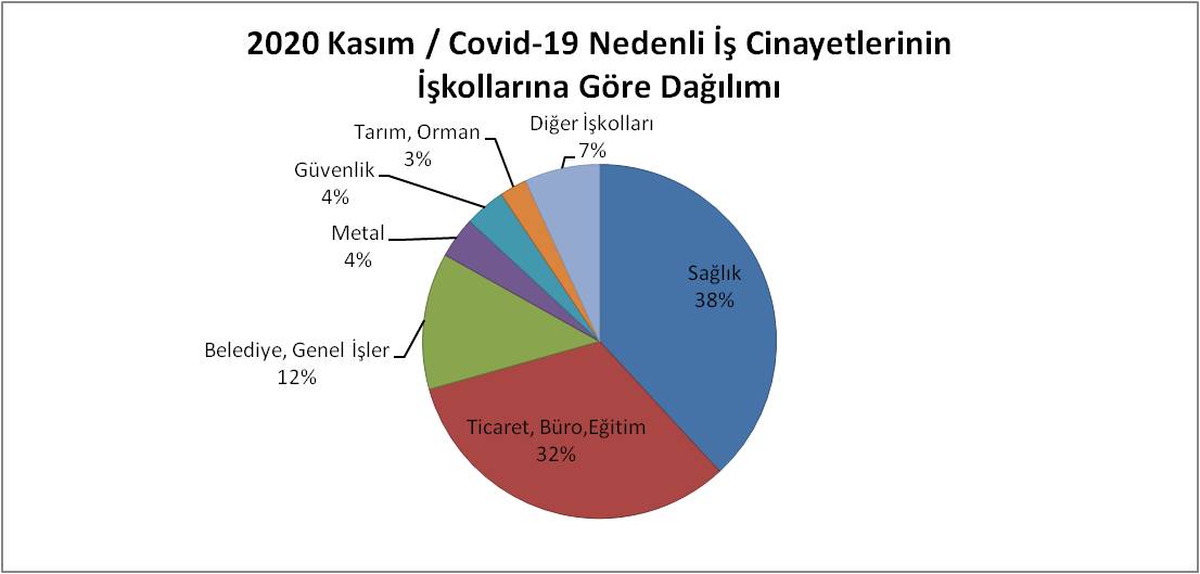 • Covid-19 nedenli ölümler sırasıyla sağlık, ticaret/büro/eğitim, belediye, metal, güvenlik, tarım, tekstil, iletişim, taşımacılık, gıda, basın ve enerji işkollarında meydana geldi.