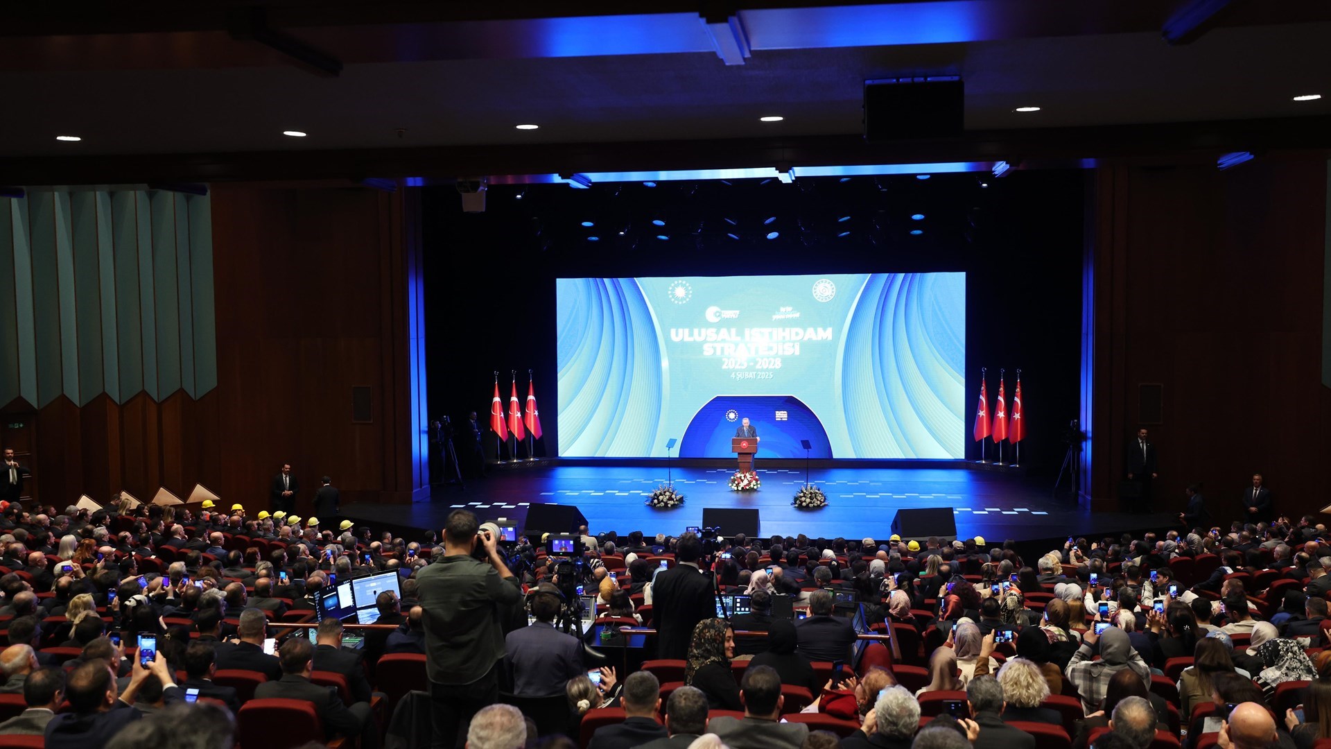 2025-2028 Ulusal İstihdam Stratejisi’nin açıklandığı tanıtım toplantısında konuşma yapan Cumhurbaşkanı Erdoğan, göreve geldikleri ilk günden bu yana; Türkiye’nin ekonomisini; üretim, yatırım, istihdam ve ihracat olmak üzere dört temel sütun üzerinde yükseltmeye gayret ettiklerinin altını çizerek, “İşçisinden memuruna, çiftçisinden esnafına, mühendisinden özel sektör çalışanına kadar herkesin kendisini güvende ve emniyette hissettiği müreffeh bir Türkiye, bizim öncelikli gündemimiz oldu. Sağlık, yarım, ticaret, ulaşım, sanayi, adalet, sosyal güvenlik, teknoloji gibi milletimizi doğrudan ilgilendiren alanlarda Türkiye’nin önündeki engelleri tek tek ortadan kaldırdık” ifadelerini kullandı.