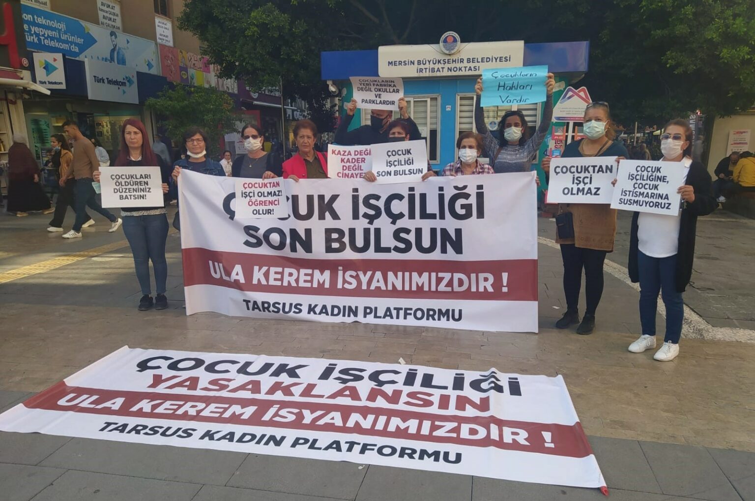 Yarenlik Alanı’nda yapılan eylemde “Çocuk işçiliği son bulsun, Ula Kerem isyanımızdır!” yazılı pankart açan kadınlar, “Çocukların hakları vardır”, “Çocuktan işçi olmaz, öğrenci olur”, “Kaza değil kader değil cinayet” ve “Çocukların yeri fabrikalar değil parklar ve okullardır” dövizleri taşıdı.