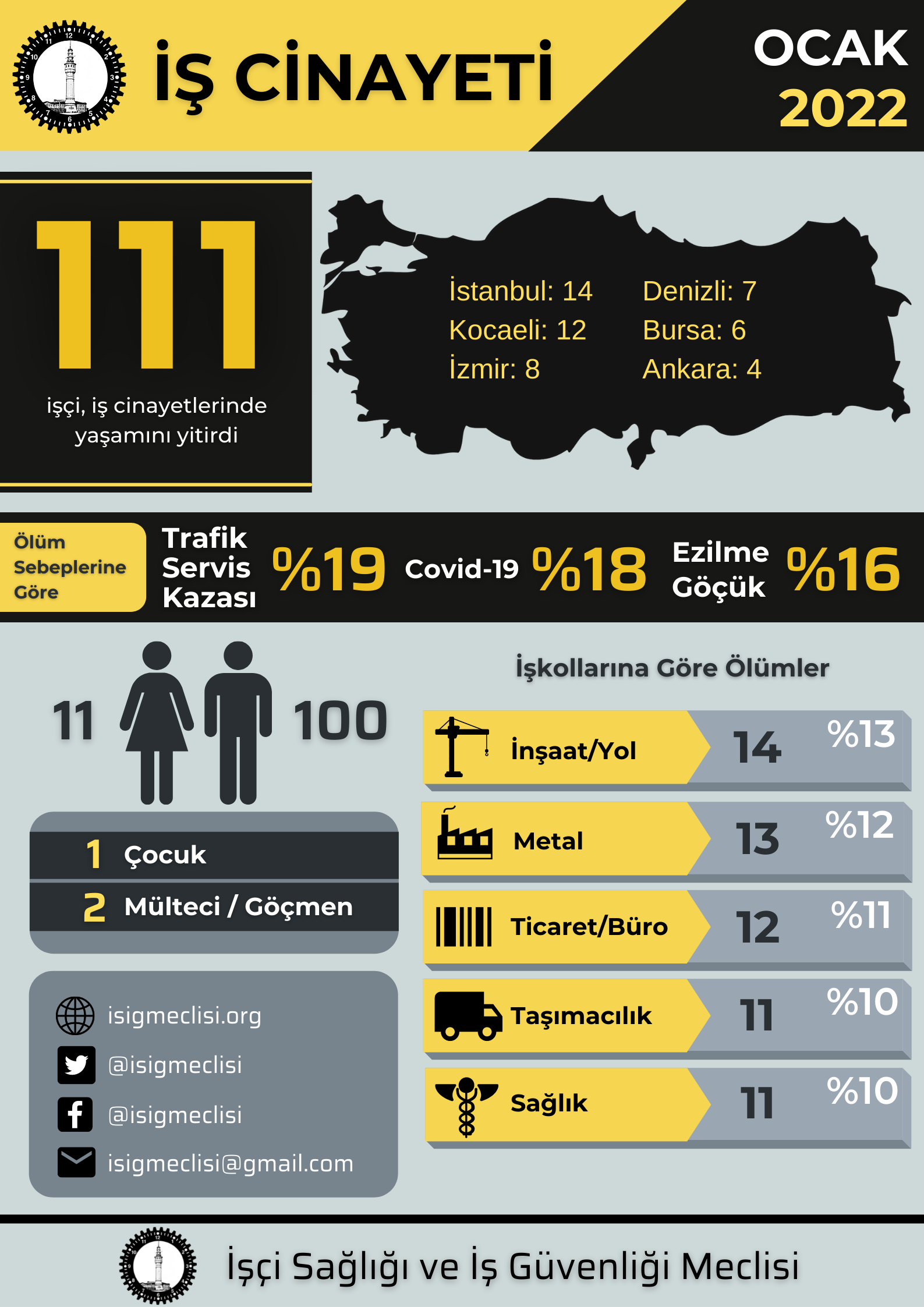 Yüzde 72’sini ulusal basından; yüzde 28’ini ise yerel basın, işçilerin mesai arkadaşları, aileleri, iş güvenliği uzmanları, işyeri hekimleri, meslek örgütleri ve sendikalardan öğrendiğimiz bilgilere dayanarak tespit ettiğimiz kadarıyla Ocak ayında en az 111 işçi iş cinayetlerinde hayatını kaybetti. 111 emekçinin 100’ü ücretli (işçi ve memur), 11’i kendi nam ve hesabına çalışanlardan (çiftçi ve esnaf) oluşuyor.
