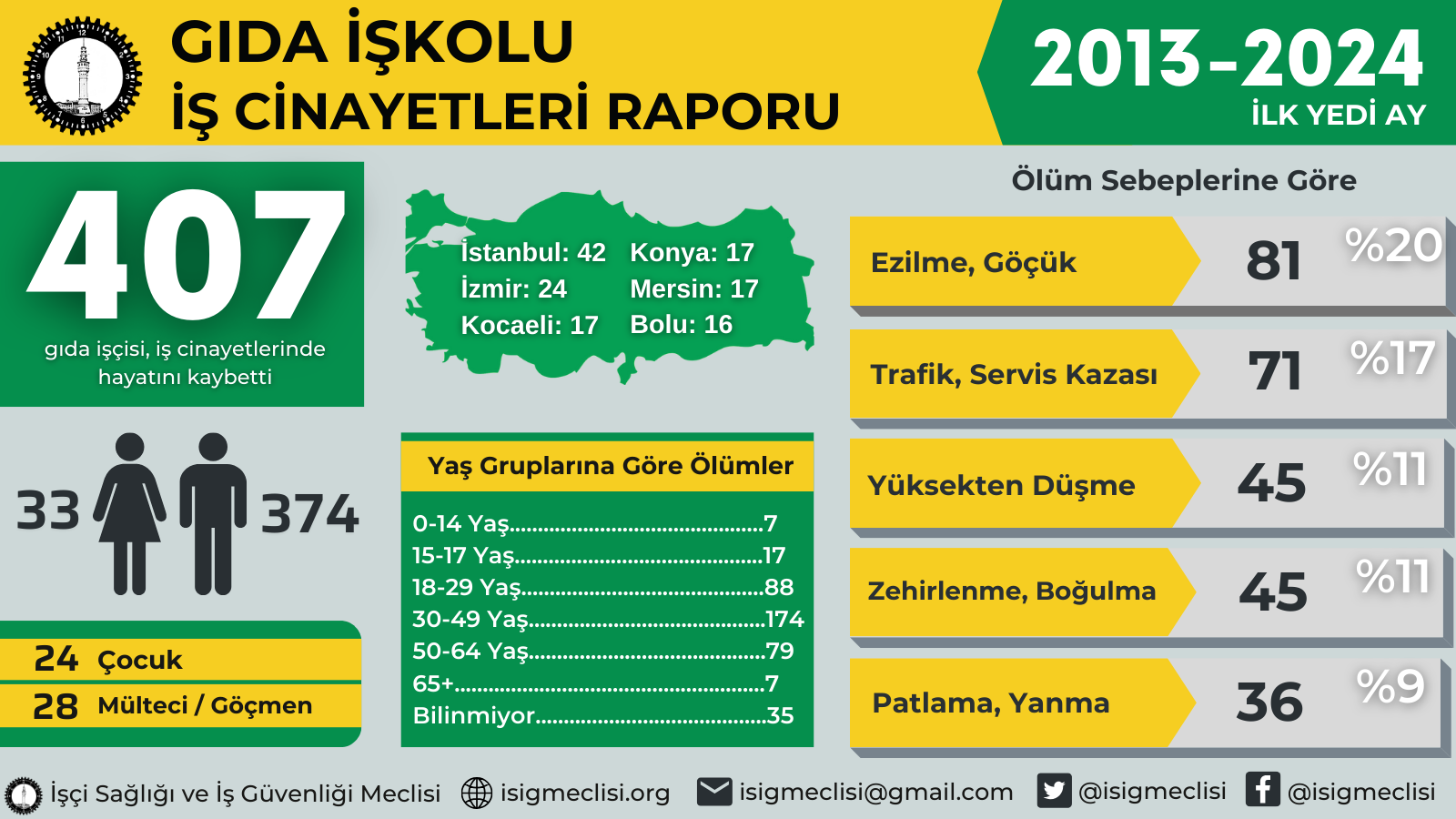 Gıda işkolunda iş cinayetlerinin cinsiyetlere göre dağılımı şöyle: 33 kadın ve 374 erkek işçi hayatını kaybetti…