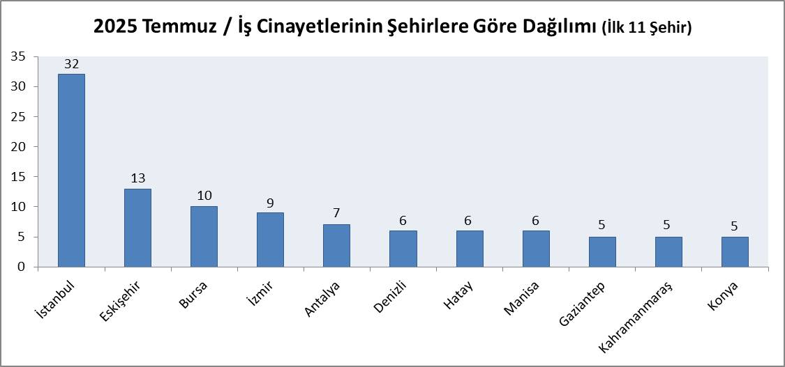 • En çok iş cinayeti İstanbul başta olmak üzere Eskişehir, Bursa, İzmir, Antalya, Denizli, Hatay, Manisa, Gaziantep, Kahramanmaraş, Konya, Aksaray, Ankara, Çorum, Düzce, Kütahya, Malatya, Mersin, Muğla, Rize, Samsun ve Uşak’ta meydana geldi.