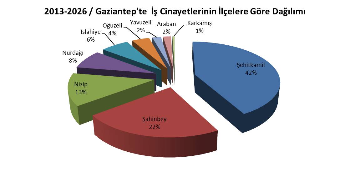 Bu tabloya baktığımızda özellikle tekstil, metal, gıda, ağaç başta olmak üzere sanayinin, yine lojistiğin merkezinin Şehitkamil olduğunu görmekteyiz. Diğer bir merkez de Şahinbey. Bu iki ilçede ayrıca inşaat başta olmak üzere belediye ve hizmet sektöründeki ölümler de yoğun. Diğer ilçelerde sırasıyla sanayinin azaldığını tarım işkolundaki ölümlerin arttığını görmekteyiz...
