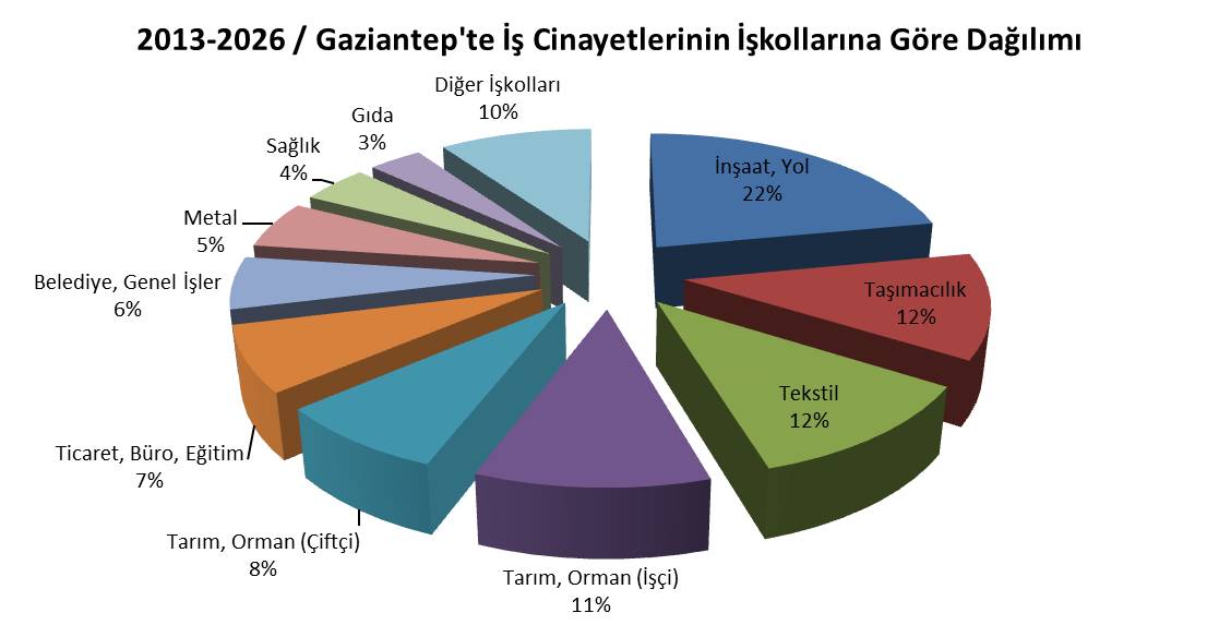 Gaziantep’te iş cinayetlerinin işkollarına göre dağılımı şöyle: