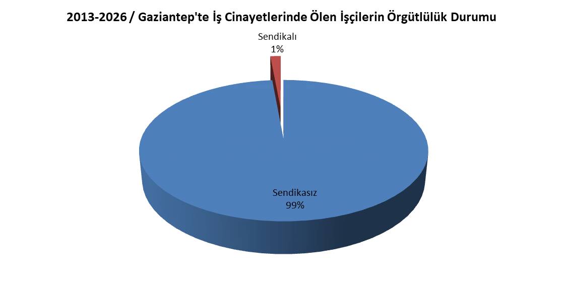Gaziantep’te iş cinayetlerinde ölenlerin 8’i (yüzde 1,44) sendikalı işçi, 547’si ise (yüzde 98,56) sendikasız. Bu noktada iki hususun altını çizmek gerekiyor.
