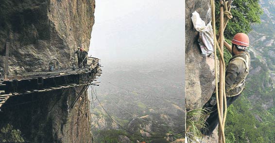 Çin’in Huan Eyaleti’ndeki Şifu Dağları’ndan yüzlerce işçi, dimdik yükselen kayalıklara bir yaya yolu inşa etmek için yıllardır uğraş veriyor. İşçiler bittiğinde 3 kilometre uzunluğuna ulaşacak yaya yolunu inşa etmek için 1000 metre yükseklikte 90 derece dik yamaçta, sadece bir metre genişliğinde bir yolu, tahta çıtalar üzerinde inşa etme çalışan işçiler sert kayalara oyuk açıp destekleri çakmak, üzerini çelik parke örüp betonla kapatmak zorunda. Çin’in bölgeye göre daha doğusundan bu iş için getirilen işçiler sıfıra yakın güvenlik önlemleri altında çalışıyorlar.