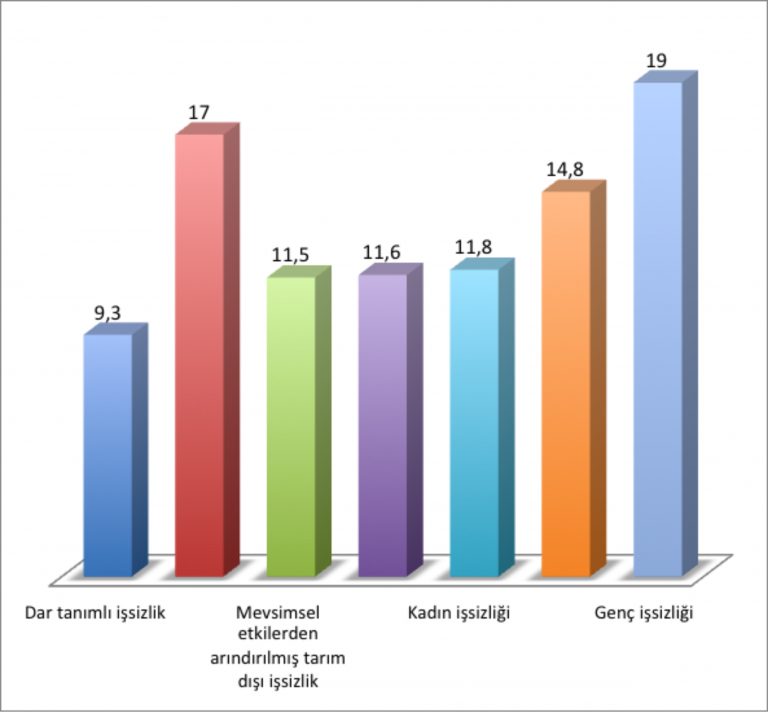 Bilindiği gibi TÜİK tarafından açıklanan dar tanımlı (standart) genel işsizlik oranı işgücü piyasalarındaki durumu bütün boyutlarıyla yansıtmıyor. Dar tanımlı işsizlik hesaplarının taşıdığı kısıtlar nedeniyle, işsizliğin gerçek boyutlarının anlaşılması için geniş tanımlı (alternatif) işsizlik verilerine ve diğer işsizlik türlerine bakmak gerekiyor. Dar ve geniş tanımlı işsizlik oranları hesaplamasına ilişkin metodolojik not rapor ekinde yer almaktadır.