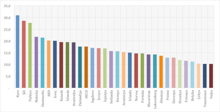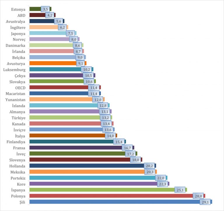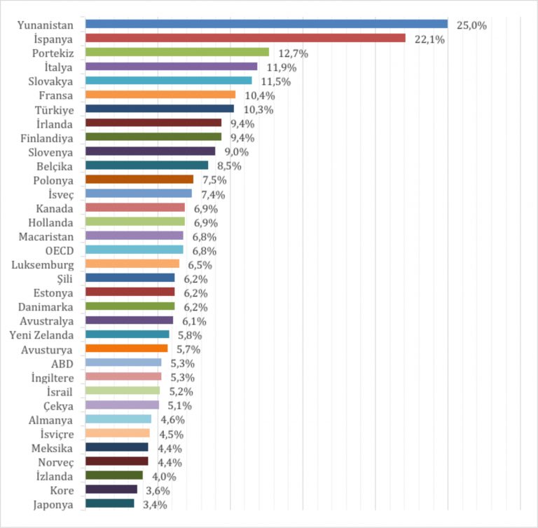 OECD İstihdam Görünüm Raporunu göre Türkiye, OECD ülkelerinde yüksek işsizlik oranına sahip ülkeler arasında yer alıyor. Raporda yer alan 2015 verilerine göre Türkiye 34 OECD ülkesi arasında yüksek işsizlik oranıyla 7. sırada yer alıyor. OECD içinde en yüksek işsizlik oranına sahip ülke yüzde 25 ile Yunanistan. Yunanistan’ı yüzde 22,1 ile İspanya izliyor. Türkiye işsizlik oranlarında yüzde 10 bandının üzerindeki ülkeler arasında yer alıyor. OECD içinde en düşük işsizlik oranlarına sahip ülkeler (yüzde 5’in altında) Almanya, İsviçre, Meksika, Norveç, İzlanda, Kore ve Japonya. OECD ülkelerinde ortalama işsizlik oranı ise yüze 6,8’dir (Grafik 2).
