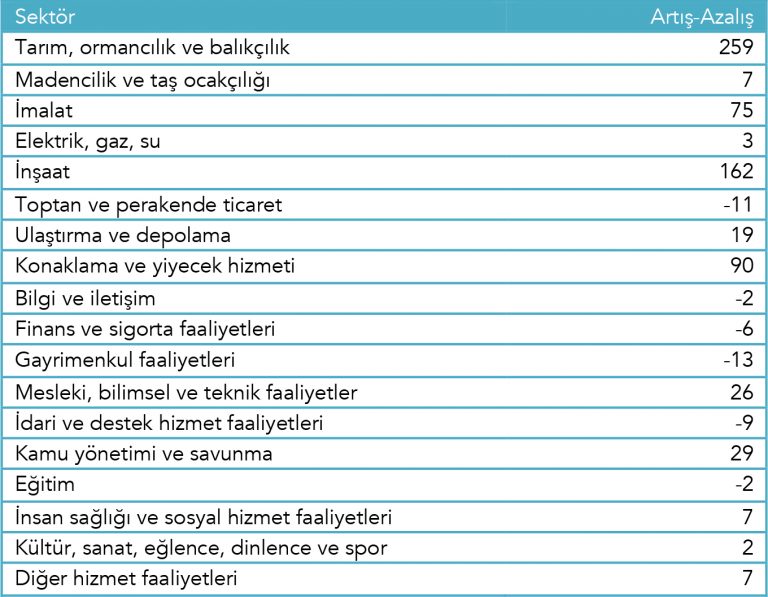 Nisan 2016 döneminde işsizlikteki düşüş gibi istihdam artışında da mevsimsel etkiler belirleyici oldu. Bir önceki aya göre (Mart 2016) istihdamda 645 bin kişilik artış yaşandı. Bu dönemde inşaatta 162 bin ve tarımda 259 bin olmak üzere toplam 421 bin kişilik istihdam artışı gerçekleşti (Tablo 1). Böylece istihdam artışını inşaat ve tarım sektörü yüklenmiş oldu. Nisan 2015-Nisan 2016 dönemine bakıldığında ise istihdamda toplam 1 milyonluk bir artış olduğu görülmektedir. Bu artışta, inşaat, ulaştırma, eğitim ile insan sağlığı ve hizmetleri sektörlerinin belirleyici rol oynadığı görülmektedir. Son bir yıl içinde inşaatta 169, eğitimde 289 bin, insan sağlığında 122 bin ve ulaştırma sektörlerinde 127 bin kişilik artış meydana geldi.