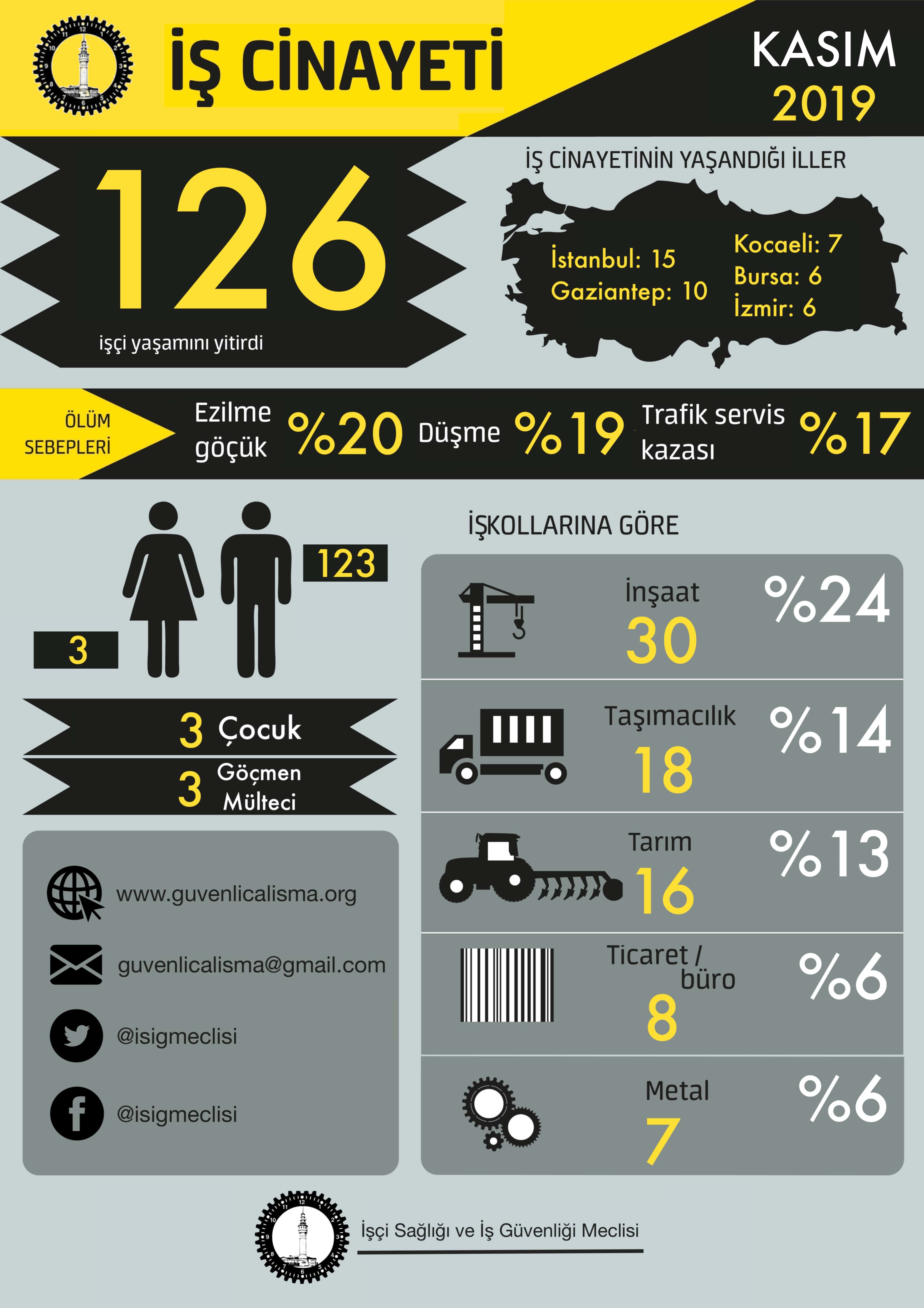 İş cinayetlerini nasıl tespit ediyoruz? Yüzde 70’ini ulusal ve yerel basından; yüzde 30’unu ise işçilerin mesai arkadaşları, aileleri, iş güvenliği uzmanları, işyeri hekimleri ve sendikalardan öğrendiğimiz bilgilere dayanarak tespit ettiğimiz kadarıyla Kasım ayında en az 126 işçi iş cinayetlerinde yaşamını yitirdi... Raporumuzda meslek hastalığı nedeniyle gerçekleşen iş cinayeti yok. Oysa ILO ve WHO verilerine göre 1 “iş kazası sonucu ölüm” karşılığında yaklaşık 6 “meslek hastalığı sonucu ölüm” olmaktadır...