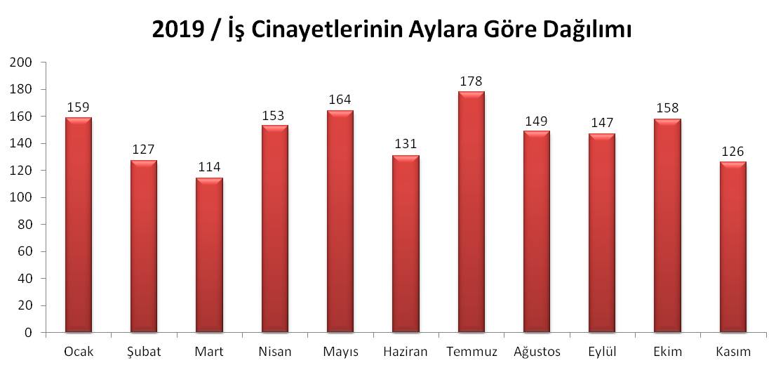 • Ocak ayında en az 159 işçi, Şubat ayında en az 127 işçi, Mart ayında en az 114 işçi, Nisan ayında en az 153 işçi, Mayıs ayında en az 164 işçi, Haziran ayında en az 131 işçi, Temmuz ayında en az 178 işçi, Ağustos ayında en az 149 işçi, Eylül ayında en az 147 işçi, Ekim ayında en az 158 işçi ve Kasım ayında en az 126 işçi olmak üzere; Türkiye’de 2019 yılının ilk on bir ayında en az 1606 işçi iş cinayetlerinde yaşamını yitirdi…