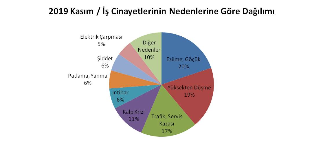 • En fazla ölüm nedenleri sırasıyla ezilme/göçük, yüksekten düşme, trafik/servis kazası, kalp krizi, intihar, patlama/yanma, şiddet ve elektrik çarpması.