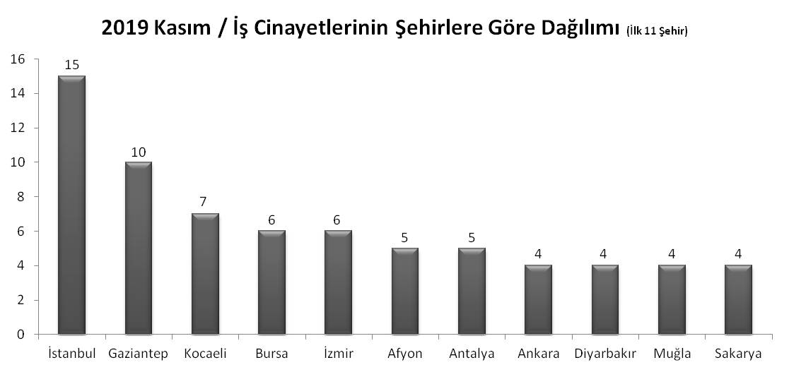 • Kasım’da Türkiye’nin 44 şehrinde ve yurtdışında 6 ülkede iş cinayeti gerçekleştiğini tespit ettik: 15 ölüm İstanbul’da; 10 ölüm Gaziantep’te; 7 ölüm Kocaeli’de; 6’şar ölüm Bursa ve İzmir’de; 5’er ölüm Afyon ve Antalya’da; 4’er ölüm Ankara, Diyarbakır, Muğla ve Sakarya’da; 3’er ölüm Balıkesir, Eskişehir, Samsun ve Şırnak’ta; 2’şer ölüm Bilecik, Çorum, Edirne, Hakkari, Kütahya, Malatya, Şanlıurfa, Uşak ve Zonguldak’ta; 1’er ölüm Adana, Aydın, Bartın, Bayburt, Çanakkale, Denizli, Elazığ, Erzincan, Gümüşhane, Karabük, Kayseri, Kırşehir, Konya, Mardin, Mersin, Niğde, Ordu, Sinop, Tekirdağ, Trabzon, Belçika, Endonezya, Irak, Kuzey Kıbrıs, Macaristan ve S.Arabistan’da yaşandı…