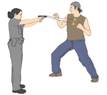 İki iğneden gelen elektrik akımı şiddetli bir kas kasılmasına ve ağrıya yol açtığı için vurulan kişinin direnmesine imkân kalmıyor. Elektrik akımı verildiği sürece kas kasılmalarıyla sarsılan kişi ancak akım kesildikten sonra istemli hareketler yapabiliyor.