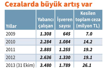 Çalışma izni olmaksızın çalışan yabancıya 731 TL, çalışma izni bulunmayan yabancıyı çalıştıran işverene her bir yabancı için 7.325 TL idari para cezası kesiliyor. Sınır dışı edilen yabancının uçak bileti parası da işverenden alınıyor. Son yıllarda kaçak çalışan yabancı sayısında üç kat artış var. İşverenlere kesilen cezalar da artış göstermiş. Ülkemizde işsizlik ve düşük ücretle çalışma sorunlarının fazla olduğu gerçeği karşısında, Bakanlığın denetimleri artırması ve sadece ihtiyaç duyulan alanlarda yabancı çalışanlara izin verilmesi en doğru yöntem olacak gibi görünüyor.